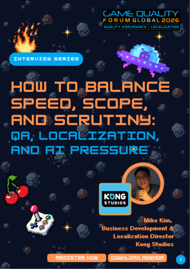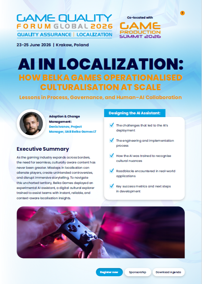The Game Quality Forum Global 2026 Agenda is here! Join leading QA and Localization leaders from studios including CD PROJEKT RED, Funcom, Playrix, Rovio, Gameloft and Focus Entertainment in Krakow, Poland, 23–25 June.Ac ...